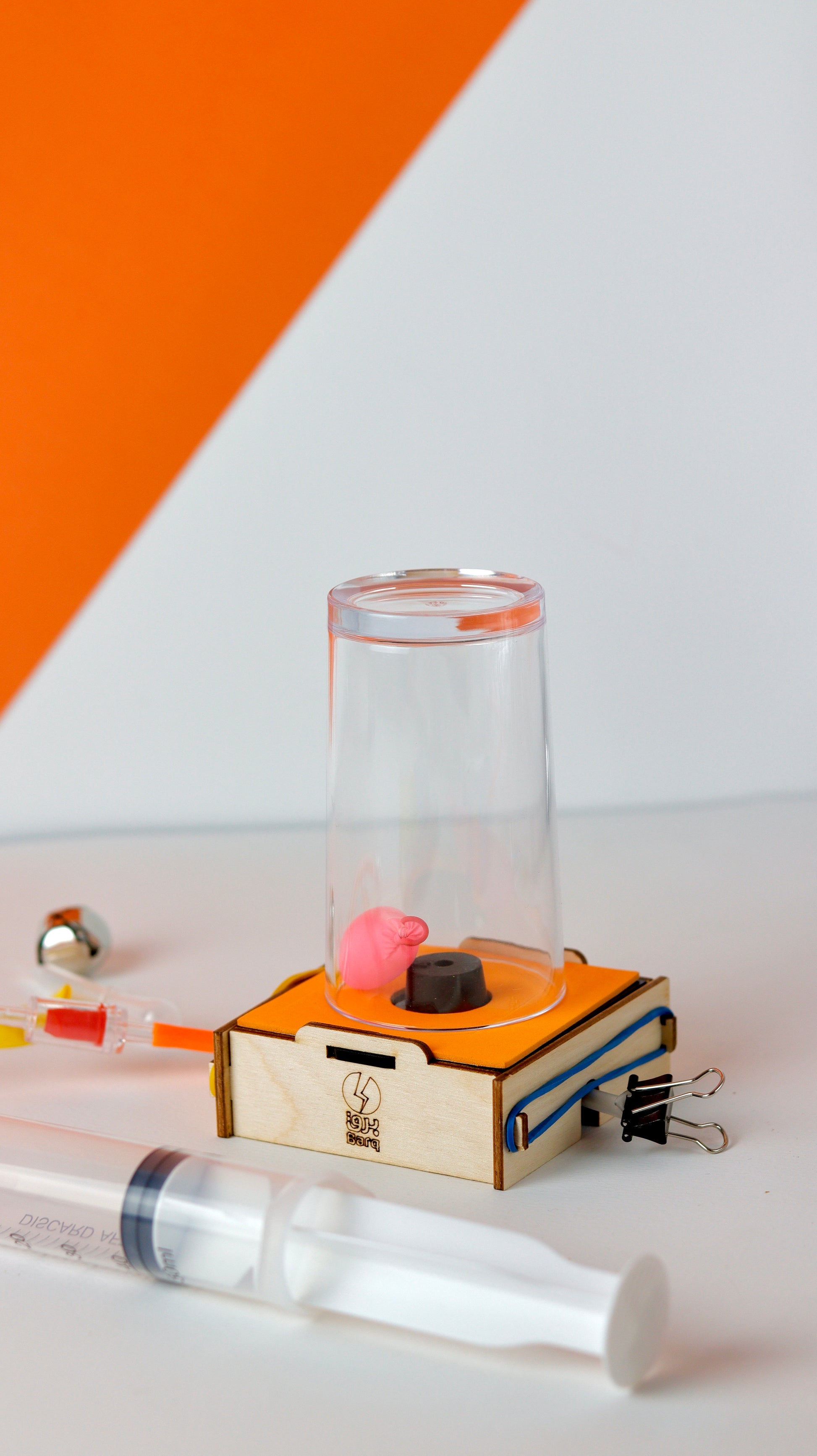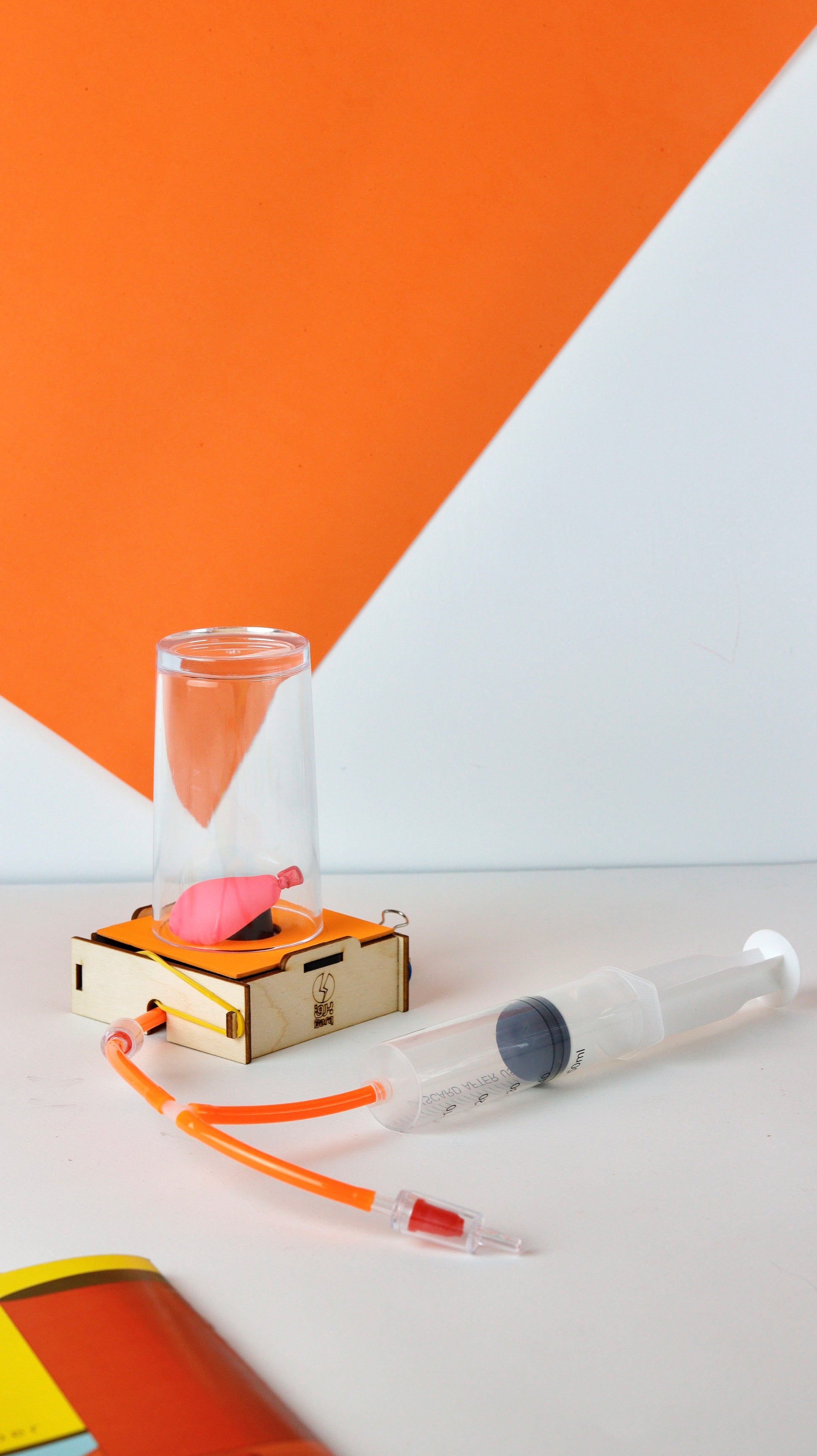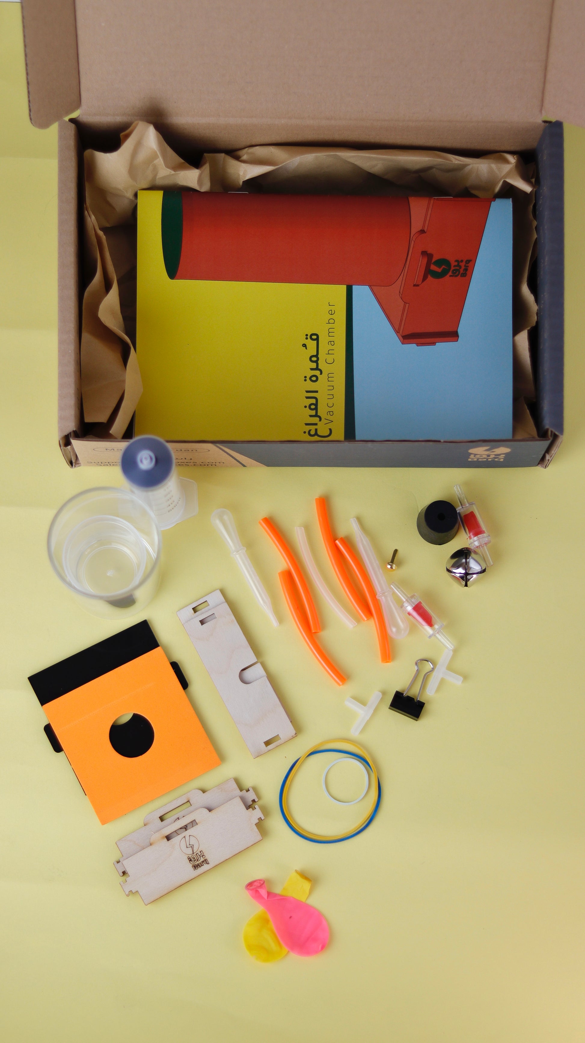 The box covers the topic of vacuum and air pressure. With the vacuum chamber box, you will be able to observe the effects on objects inside a small chamber when air is evacuated (creating a vacuum). Additionally, through the magazine, you'll familiarize yourself with the concept of air pressure and how a vacuum chamber works, along with experiments related to the topic.