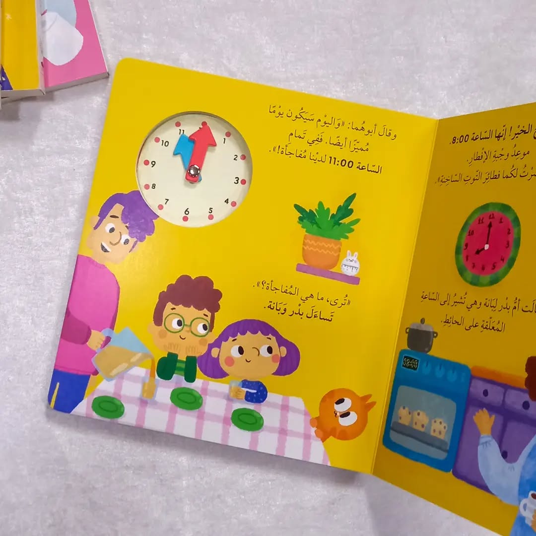 حرّك عقارب الساعة. وقم بمساعدة بدر بينما يتعلم قراءة الوقت. فالعقرب القصير يشير إلى الساعات. والعقرب الطويل يشير إلى الدقائق