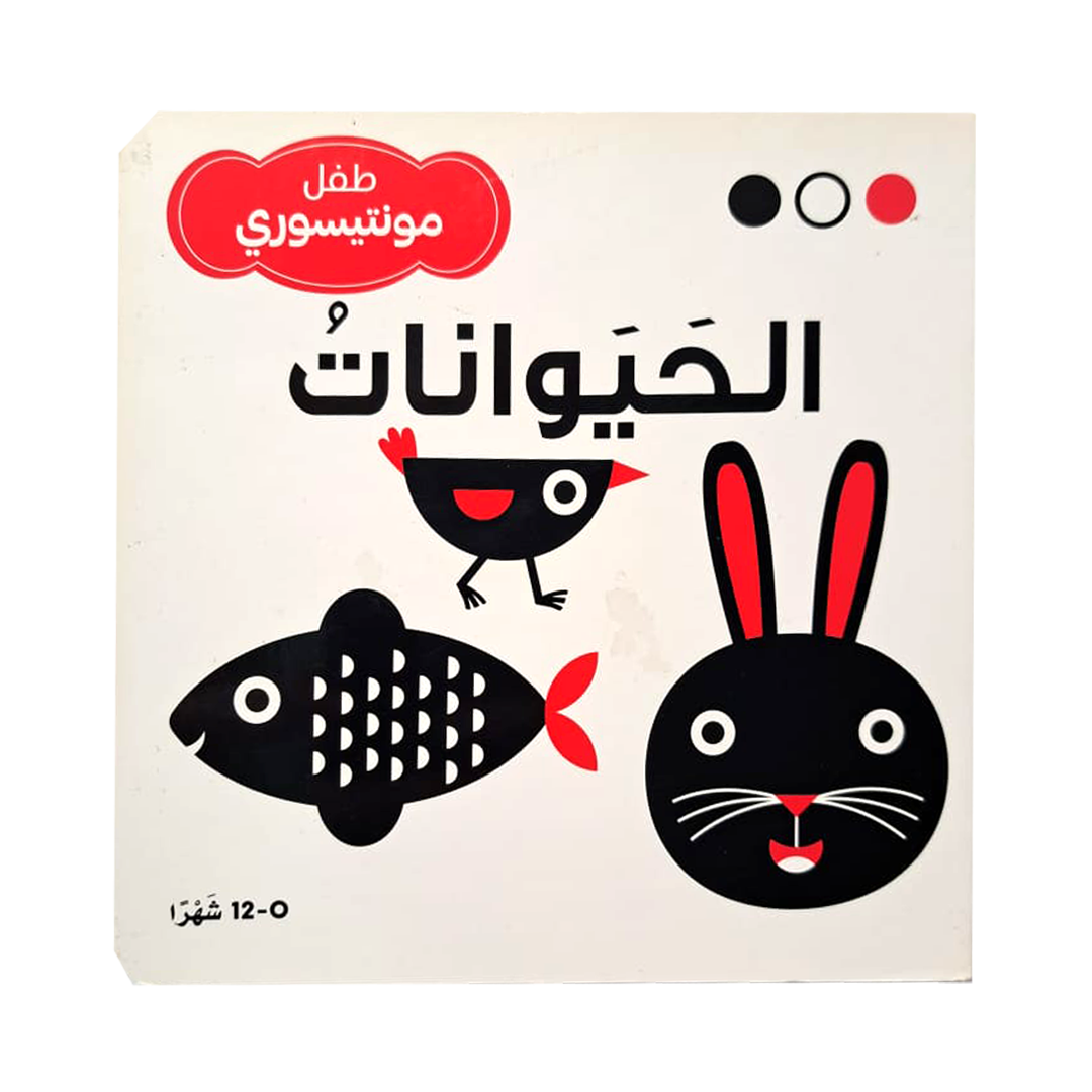 كتاب أبيض و اسود مستوحى من منهج مونتيسوري يحتوي على العديد من صور الحيوانات المختلفة تساعد الطفل على اكتشاف العالم .