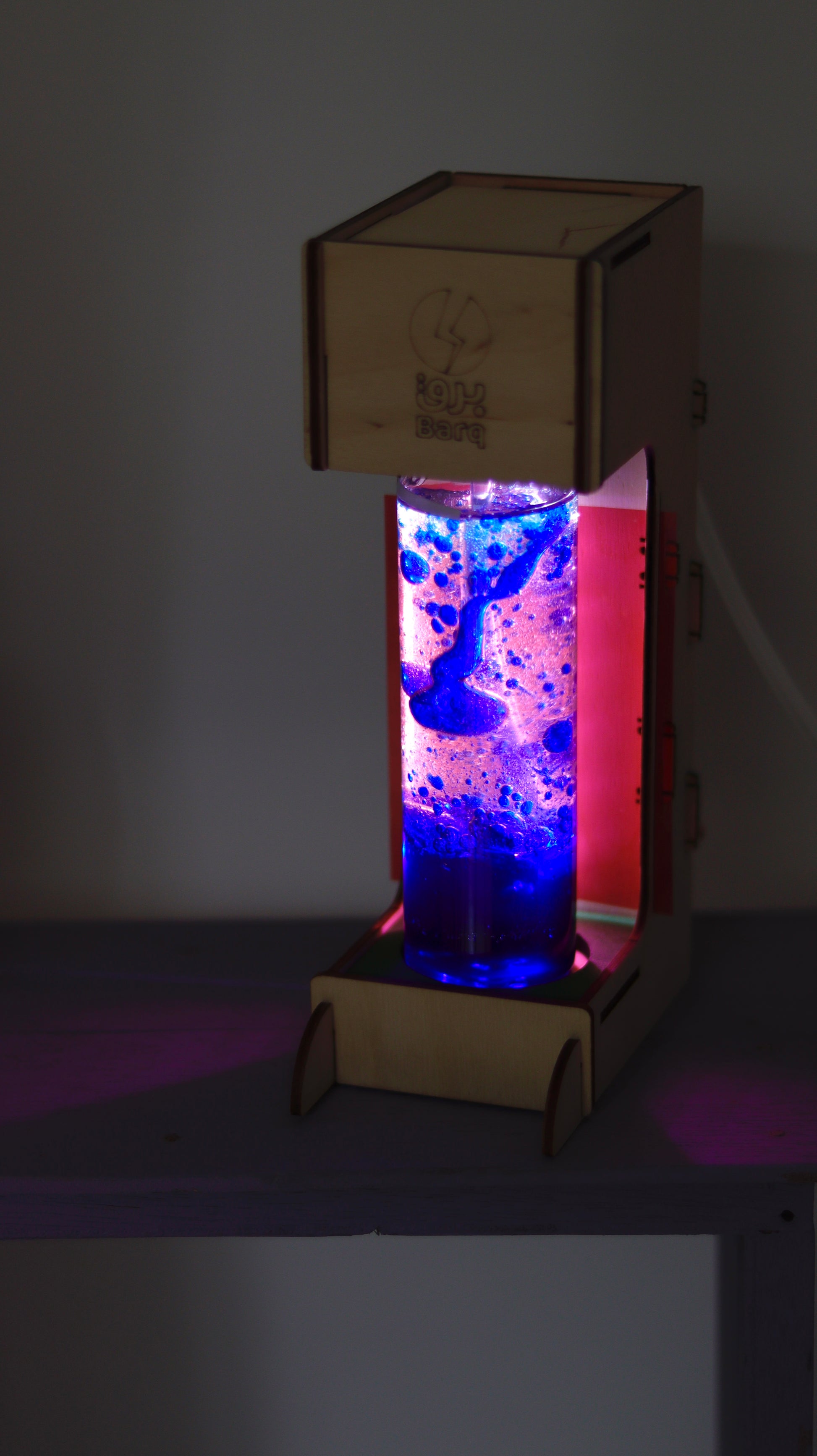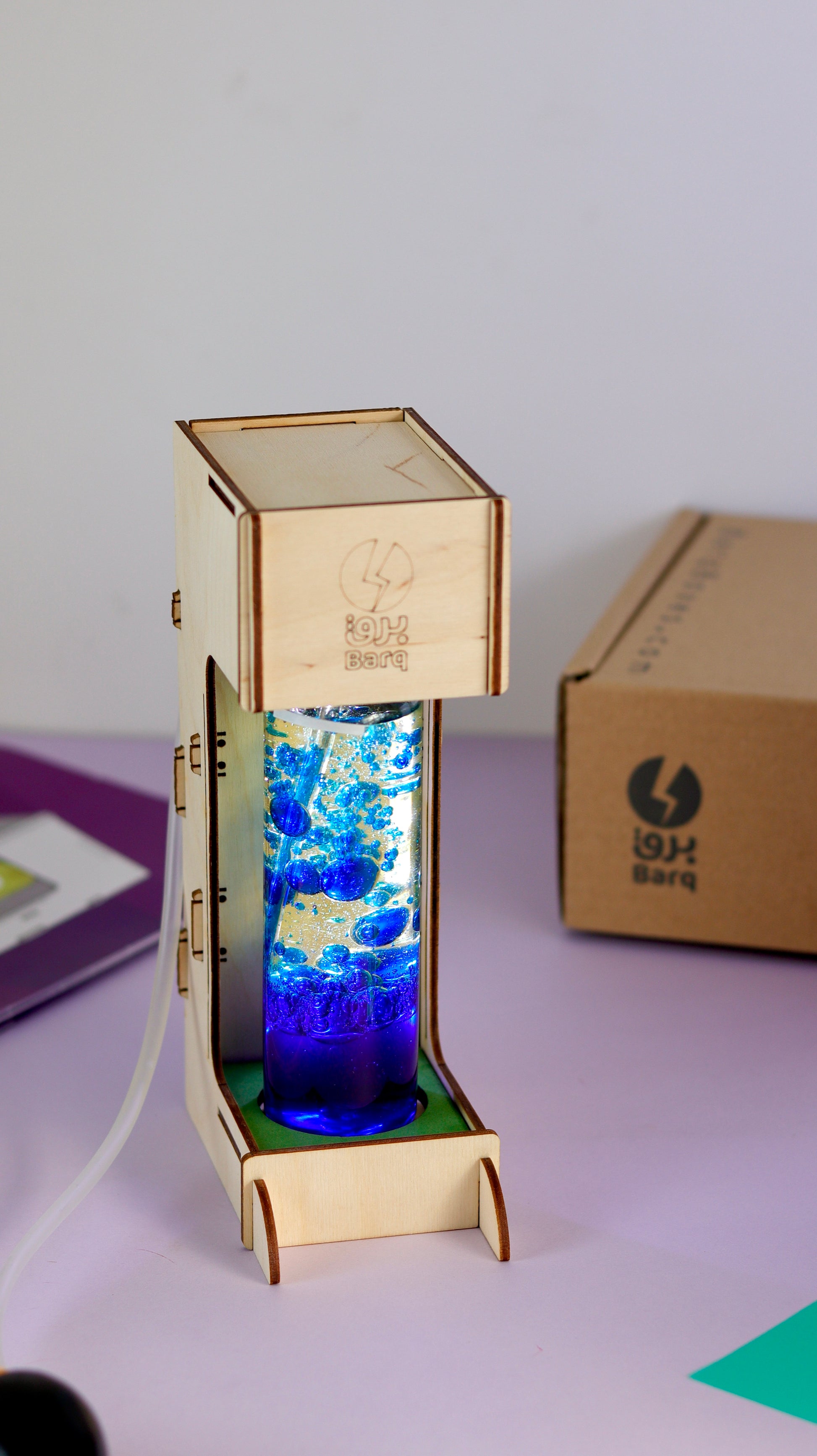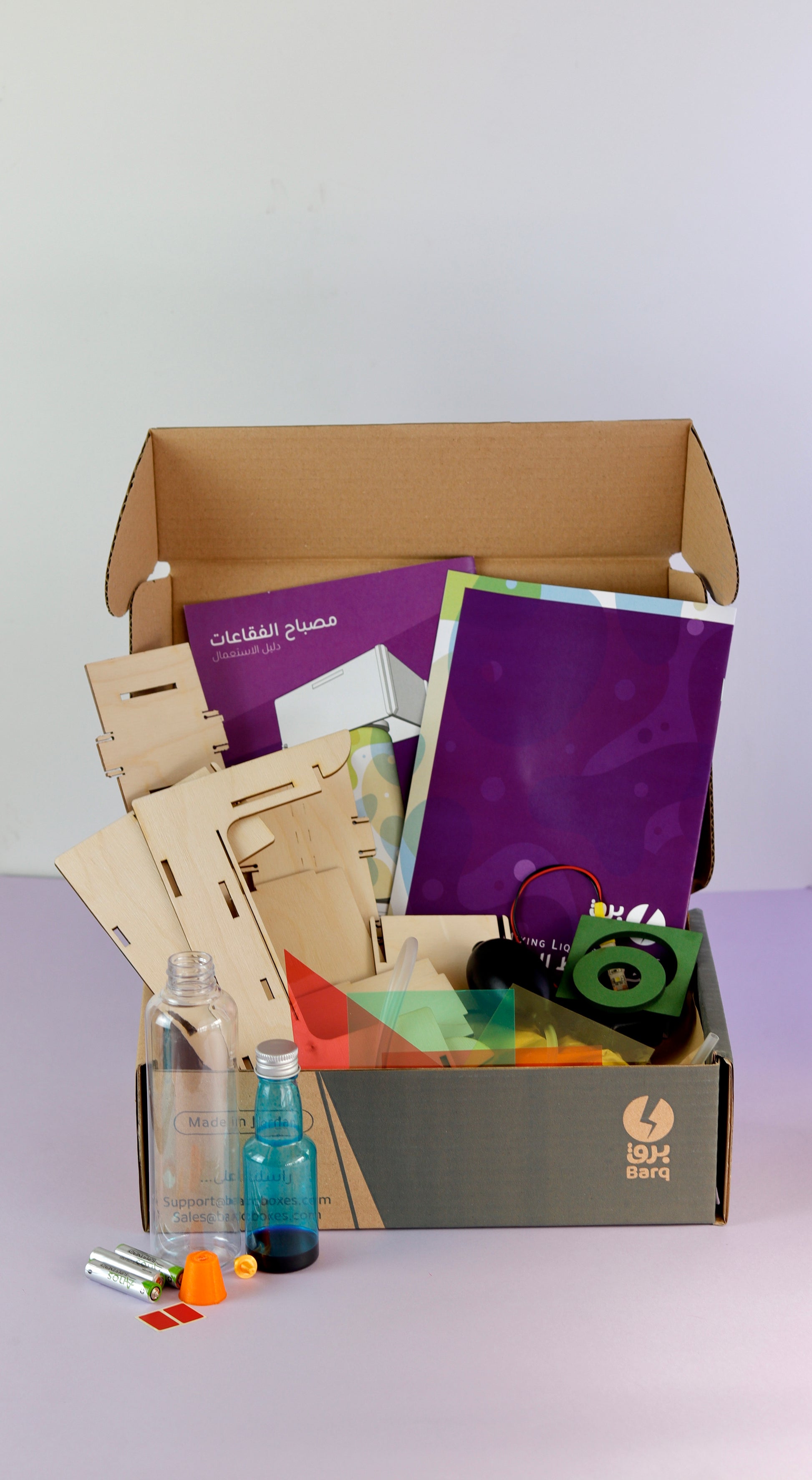 ستتعرف أكثر في هذا الصندوق على السوائل. ستصنع مصباح فقاعات ثم ستكتشف السبب العلمي وراء حدوث هذه الفقاعات الملوّنة. كذلك يمكنك تطبيق تجربة المجلة لعمل أداة مبسّطة لقياس كثافة الأشياء.