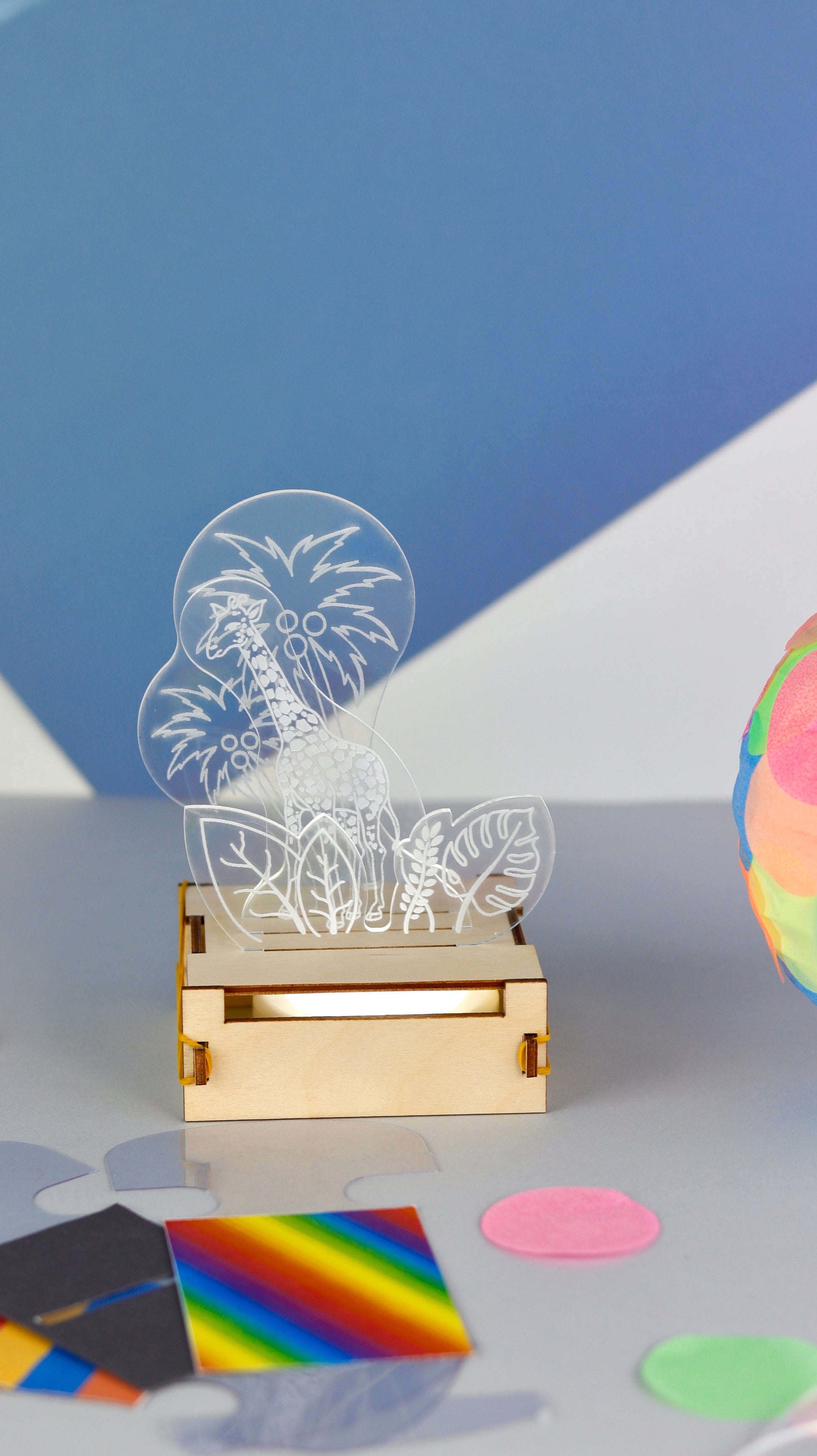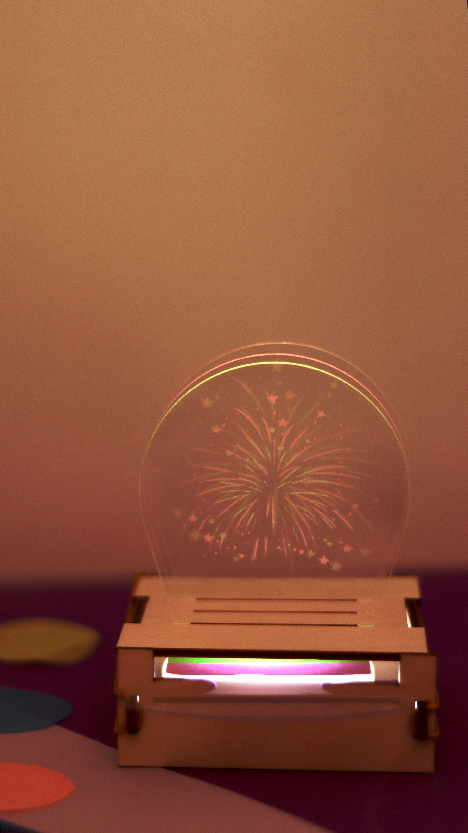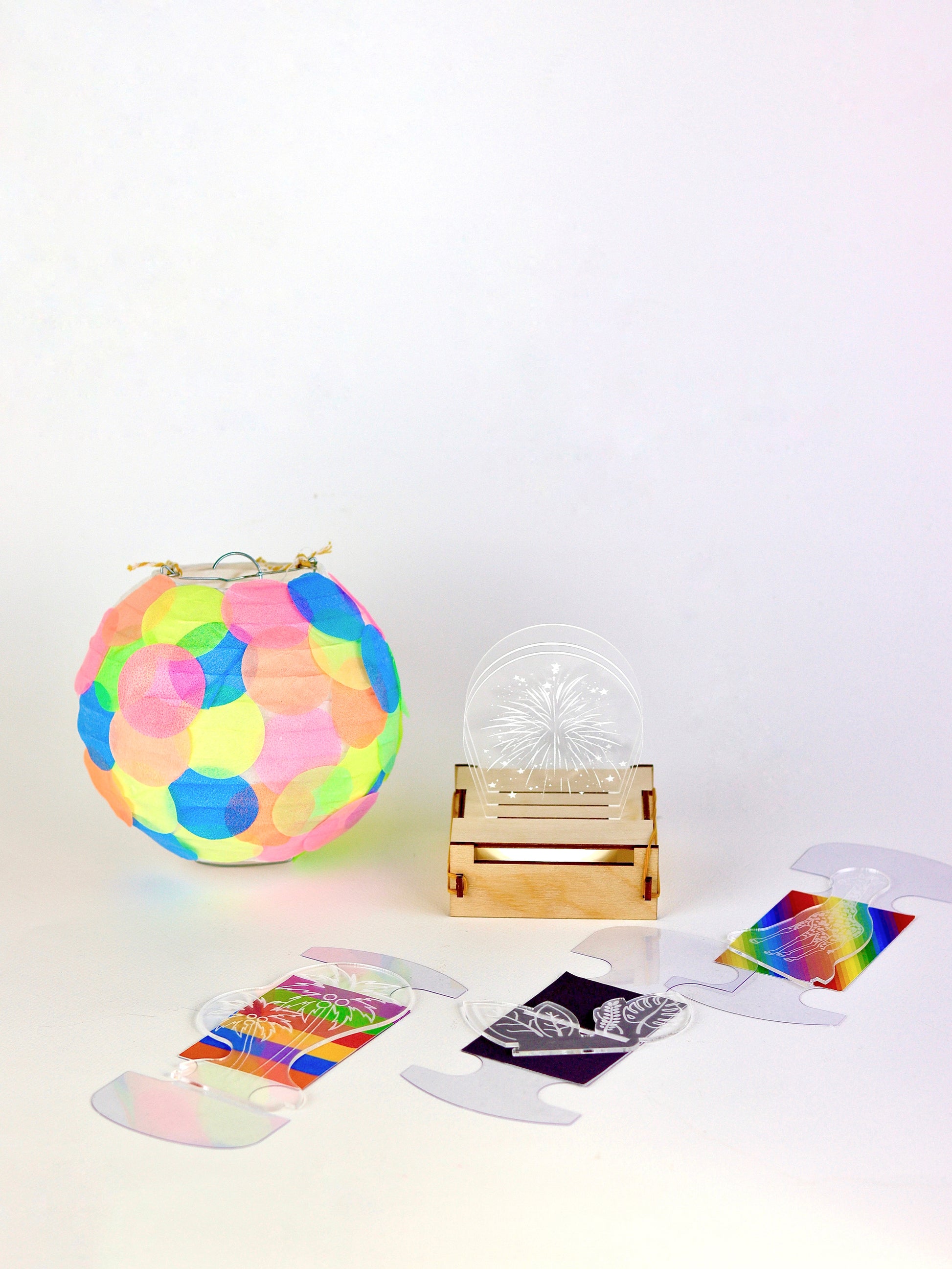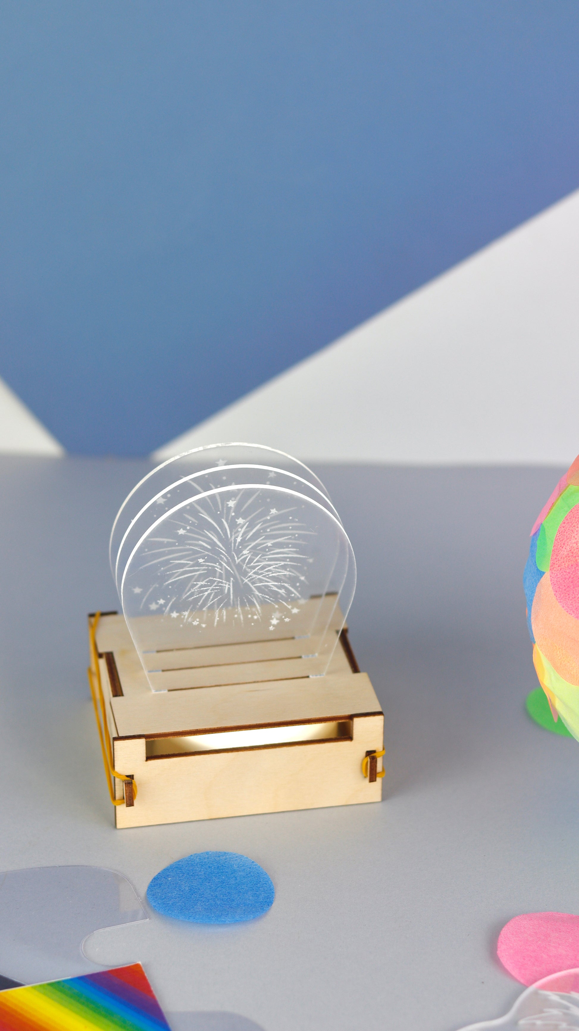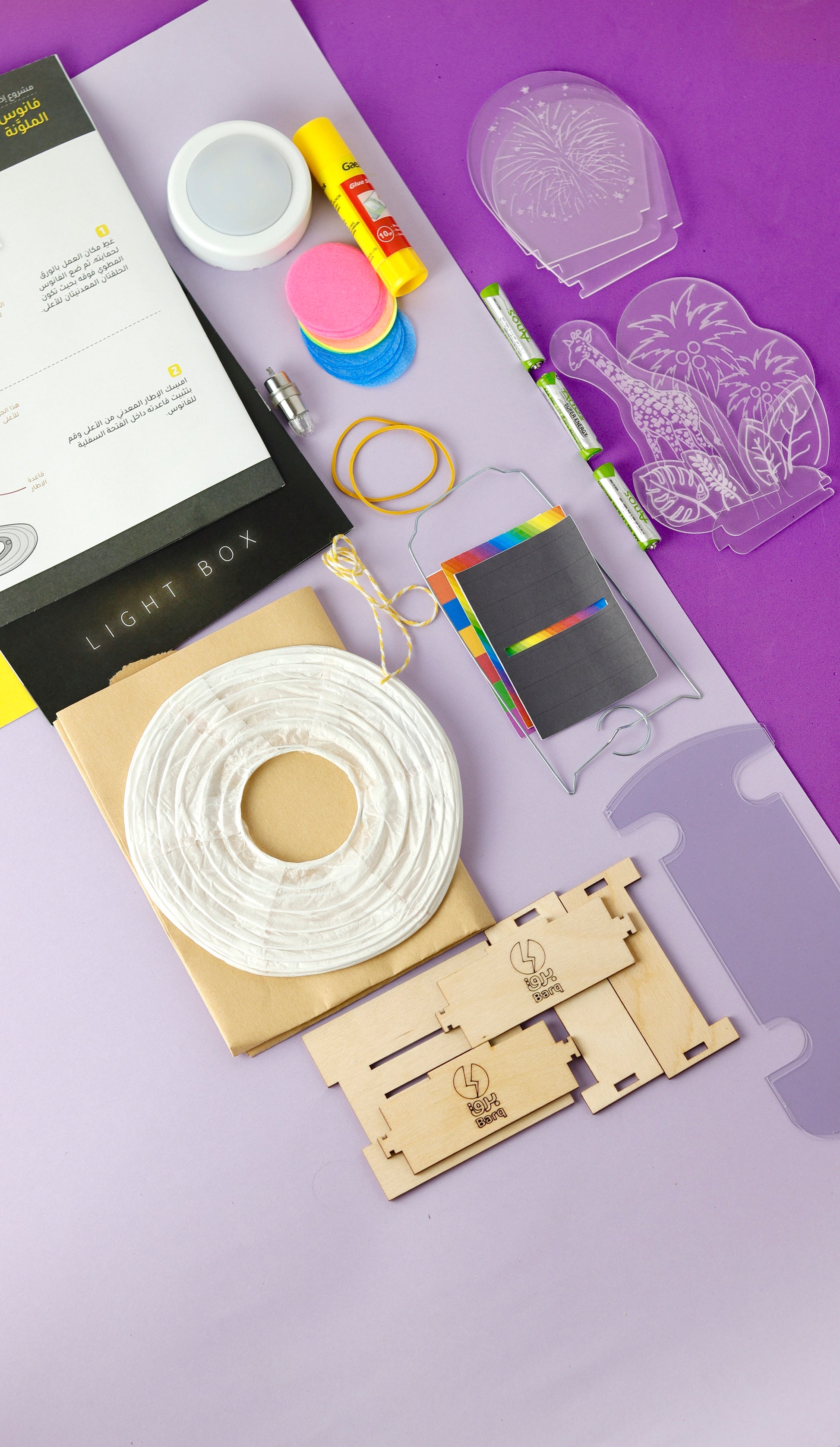 Learn more about light with this box. Assemble the light box and see what happens when light is refracted, creating various colorful light scenes. Then, through the magazine, understand the relationship between light and vision, and explore the use of light in areas beyond illumination. Finally, create a lantern with colored circles.