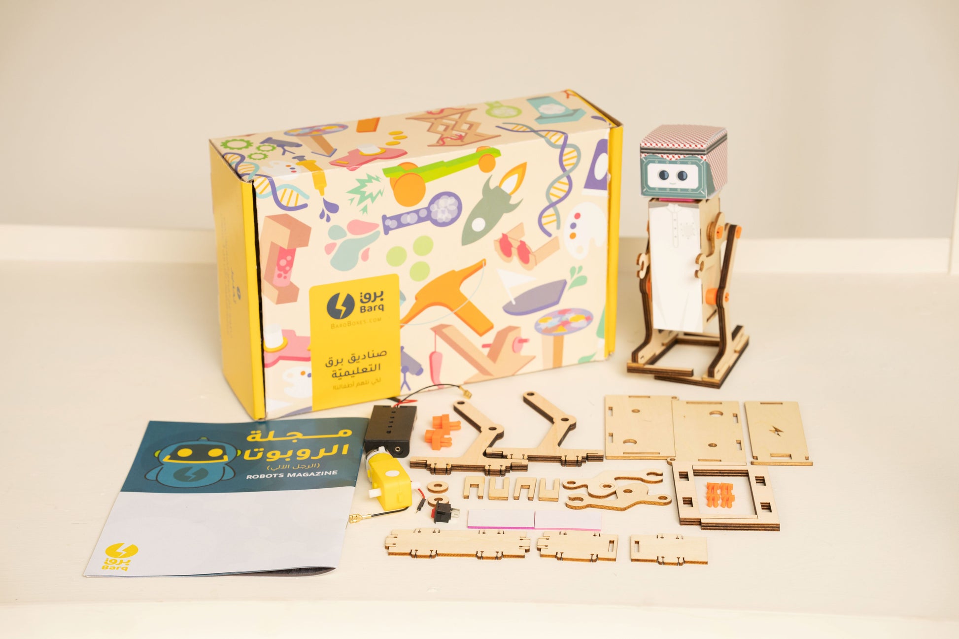 هل سبق لك اللعب بروبوت من قبل؟ .في هذا الصندوق ستقوم ببناء لعبة روبوت متحرِّك ثم تشغيله .ستطلعك مجلة الصندوق على ما يميِّز الروبوتات عن الآلات الأخرى كما ستأخذك في رحلة لتستكشف أنواع الروبوتات المتنوّعة والغريبة من حول العالم. في نهاية المجلة ستتعرّف على بعض الروبوتات التي صعدت للمريخ وسبب وجودها على سطحه .