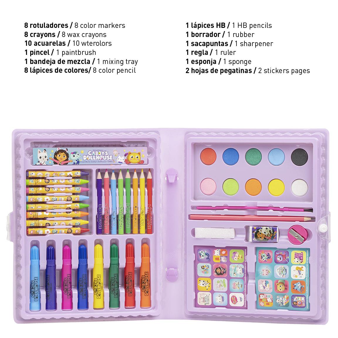 يتضمن هذا الطقم أدوات تلوين ولوازم مكتبية مستوحاة من مسلسل "غابي دارلهاوس"، مثل أقلام تلوين، وأوراق تلوين تحمل شخصيات العرض. مصمم لتحفيز الإبداع وتوفير ساعات من المرح الفني.