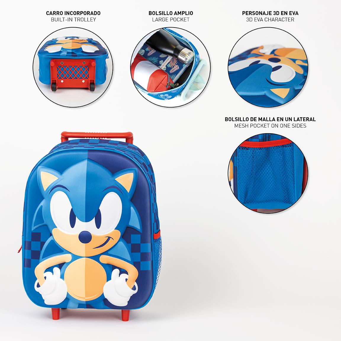 The Cerda Kids Backpack Trolley with 3D Sonic design features fun 3D character applications and wheels for easy carrying. It includes a spacious main compartment and adjustable straps for comfort. Made from durable materials, perfect for everyday use.