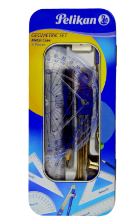 9-piece complete set: compass, divider, 15cm ruler, 180˚ protractor, 60˚ and 45˚ set square ruler, eraser, sharpener and pencil.