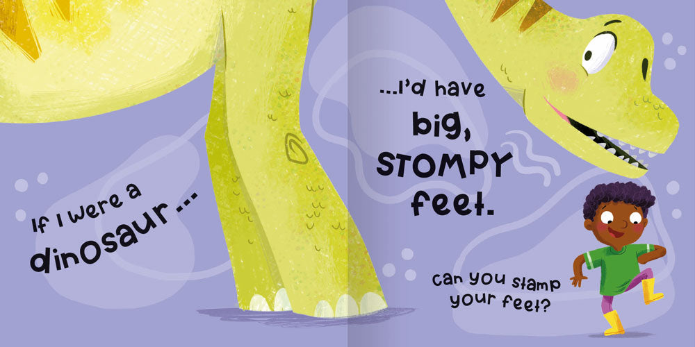 Let your young child's imagination run riot while they copy the fun actions in this beautifully illustrated book. Actions include gross motor movements such as pretending to stomp like a dinosaur, using their voice such as roaring like a dinosaur, and considering new ideas such as pretending to have claws.