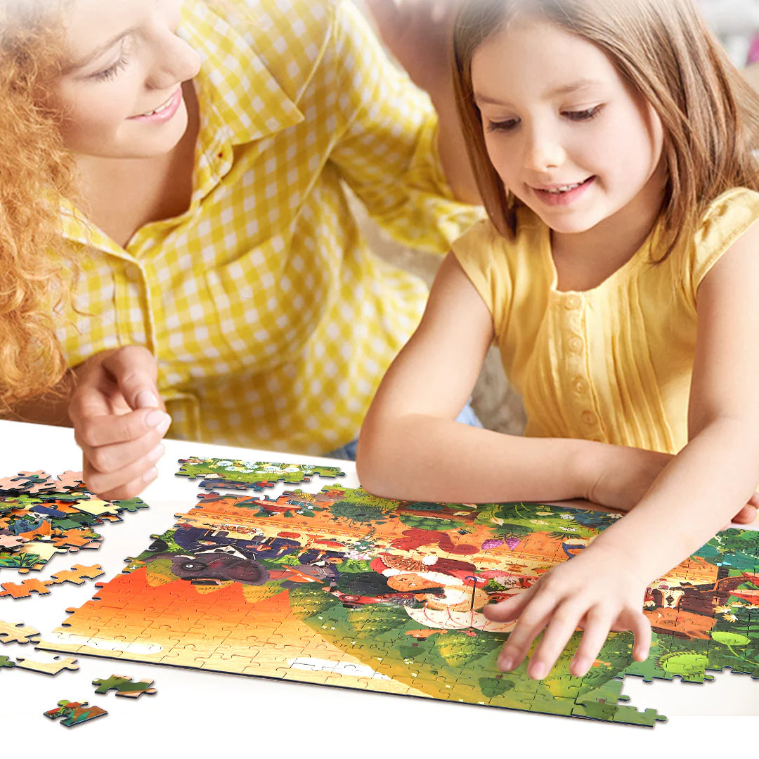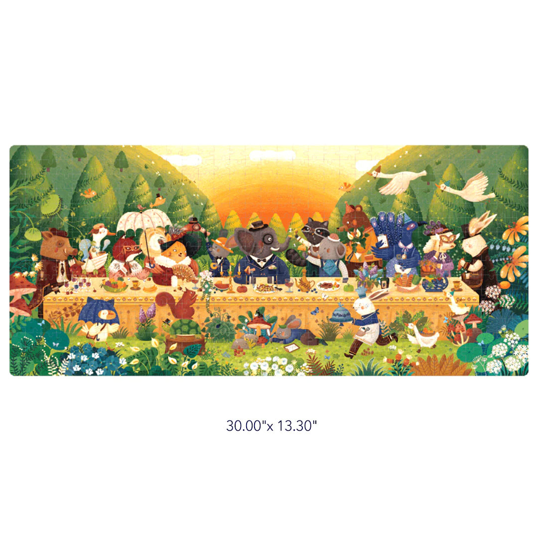 German imported blue paperboard artist puzzle series is both artistic and full of children’s fun. Exercise children’s concentration and logical thinking. This puzzle features forest animals around a long table at sunset, ready to start a carnival. Pencil drawing textures create a beautiful party scene.