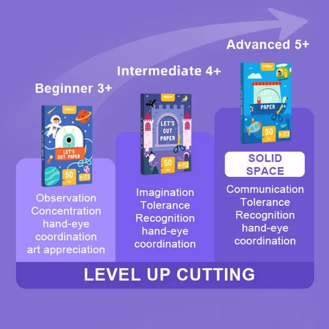 طقم تقطيع الورق من سلسلة "دعونا نقطع الورق" بمستوى متقدم يعزز تواصل الطفل، وصبره، والتعرف على الأشكال، بالإضافة إلى تنسيق اليدين والعينين. يتضمن الطقم 50 ورقة مقطوعة، مع ملصق مكافأة وشهادة إنجاز، مما يحفز الطفل على التقدم والتعلم بشكل ممتع.