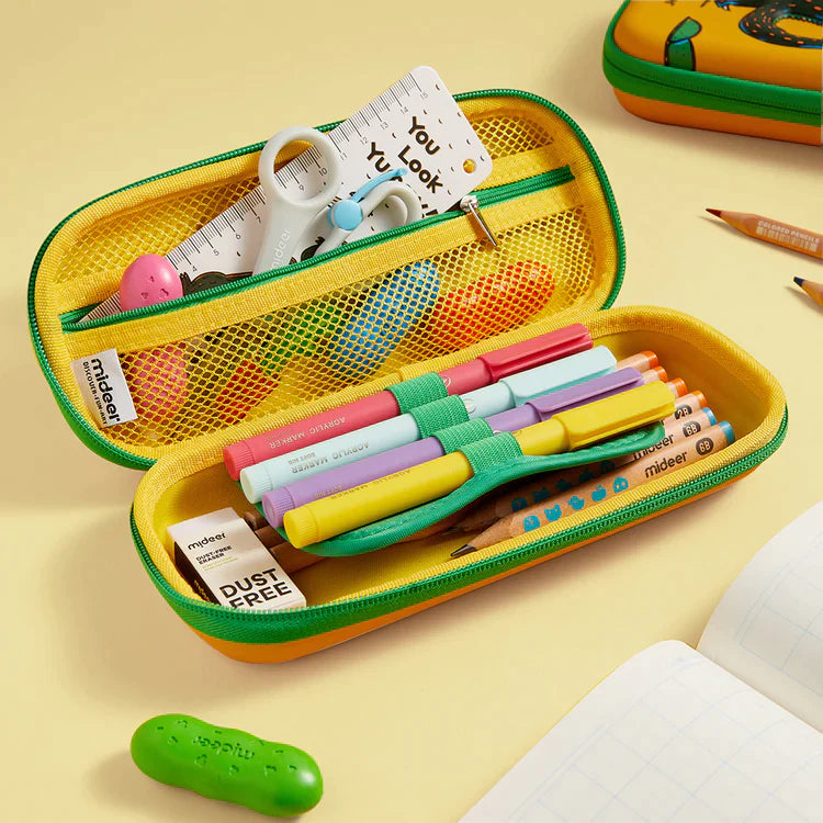 This T-Rex pencil case features a compartmentalized design for easy storage. It includes a mesh compartment, elastic slots, a main compartment, and 3 layers to organize kids' stationery. Waterproof and stain-resistant, it is easy to clean!