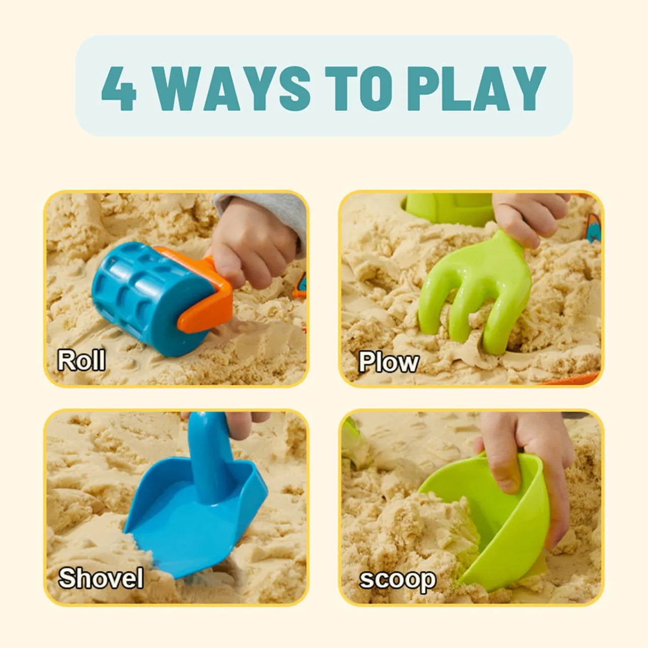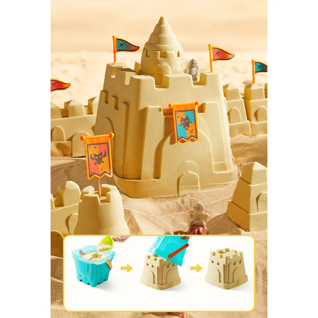👜It includes: 3 castle molds, 1 scoop tool, 1 shovel, 1 roller, 1 rake, 8 castle flags, 4 soldiers.