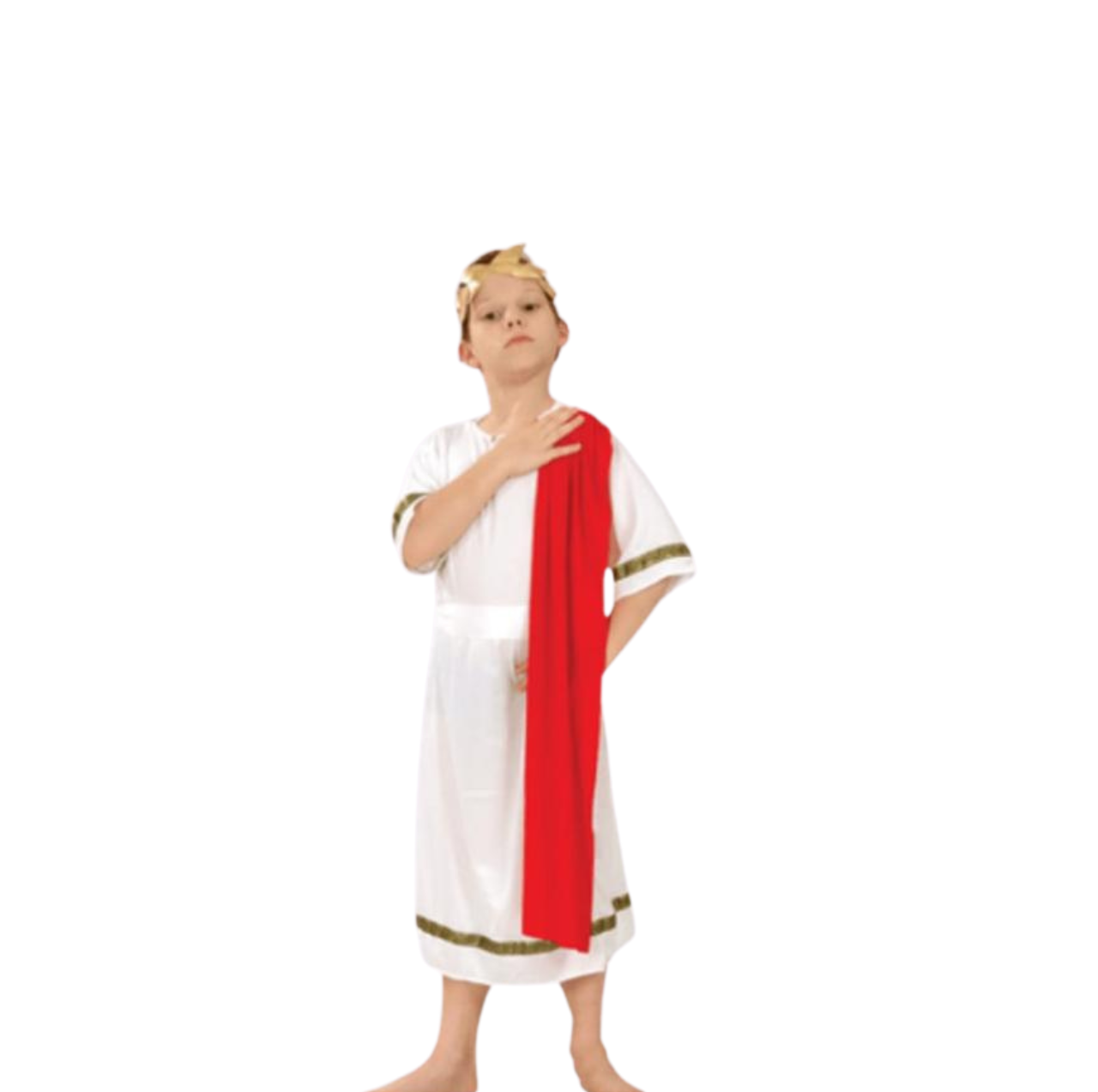 Featuring a flowing white robe, vibrant red scarf, and a shining gold headband, it’s perfect for little ones who love history, bravery, and adventure. Ideal for parties, dress-up, or heroic moments—this costume is made to shine like a true Roman leader!