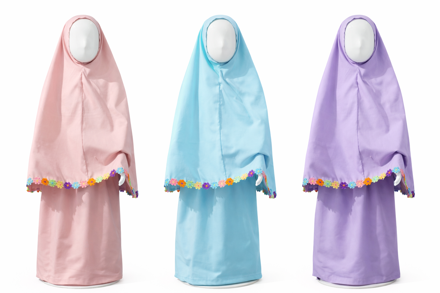 Colorful Kids’ Prayer Set with Floral Trimming A beautiful and comfy prayer set just for kids! It comes in fun, bright colors with cute floral trimming. Soft, light, and easy to wear—perfect for little ones during prayer time or as a sweet gift.