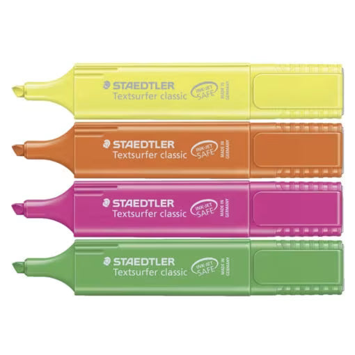 These Staedtler Textsurfer Classic Highlighters are perfect for drawing attention to information on paper, copy and faxes. They have a strong, pigmented ink with a soft chisel nib which makes using the highlighters simple and easy. These highlighters can be used over inkjet prints, ink and lead pencil without smudging.