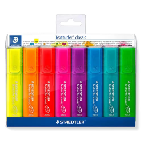 These Staedtler Textsurfer Classic Highlighters are perfect for drawing attention to information on paper, copy and faxes. They have a strong, pigmented ink with a soft chisel nib which makes using the highlighters simple and easy. These highlighters can be used over inkjet prints, ink and lead pencil without smudging