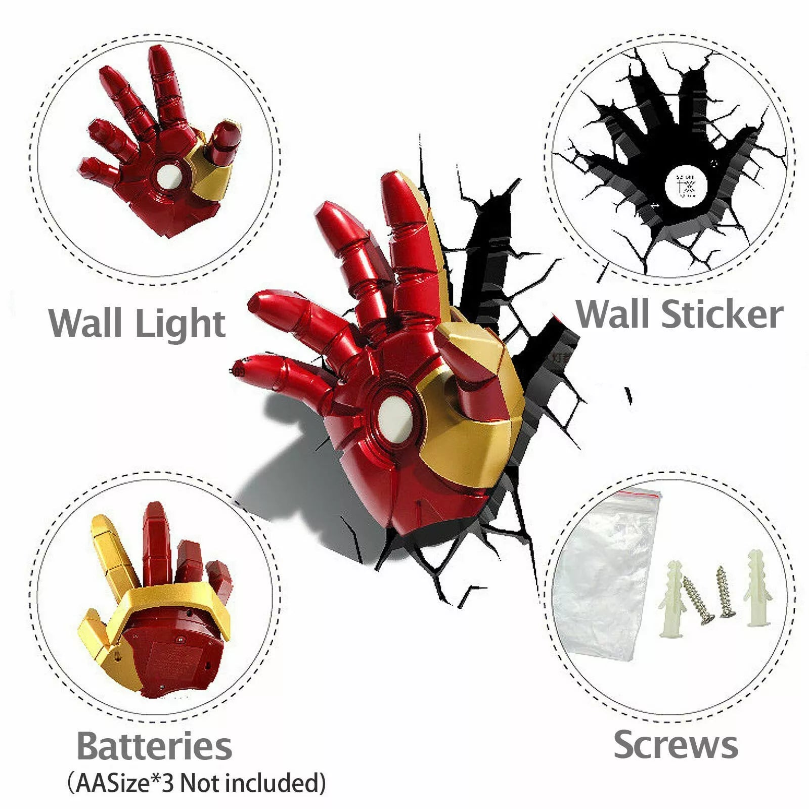 Iron Man Hand Hand and 3D Wall Art Nightlight will send all of the menacing shadows in your little superhero's room running for cover. This awesome Night Light gives the illusion of the mighty Iron man's Hand bursting through the wall to heroically light up the night. Stays cool to touch, Cordless and battery operated making it safe for children's bedrooms. Easy to use on/off switch.