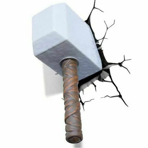 Thor's Hammer Nightlight with 3D Wall Art will make all the scary shadows disappear in your little hero's room. This amazing nightlight creates the illusion of Thor's powerful hammer bursting through the wall to heroically light up the night. It stays cool to the touch, is cordless, and battery-operated, making it completely safe for children's bedrooms.