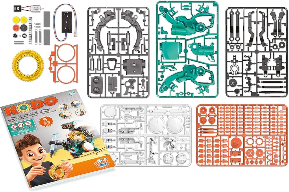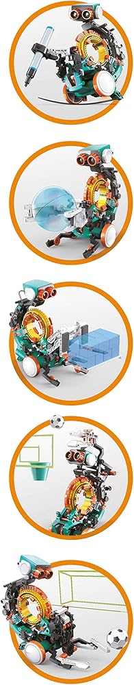 Robot Kits for future engineers! Build, learn, and have fun with electronics, mechanics, and hydraulics. This beginner-level STEM coding robot introduces users to mechanical engineering and coding basics, encouraging problem-solving skills. The mechanical coding wheel steers the robot’s tasks, allowing it to perform actions like moving forward, backward, turning, spinning, or pausing by snapping coding buttons onto the wheel.
