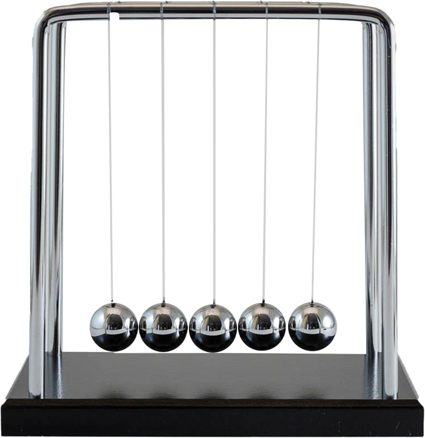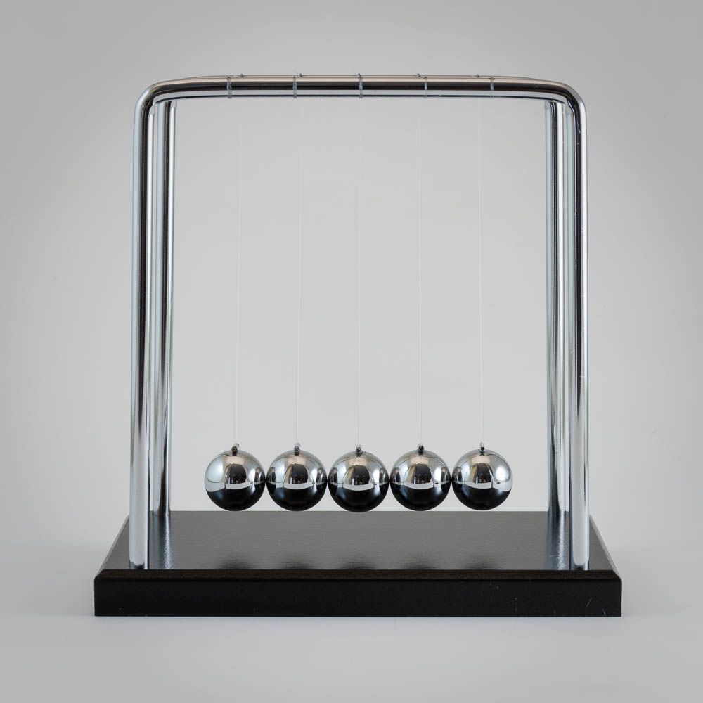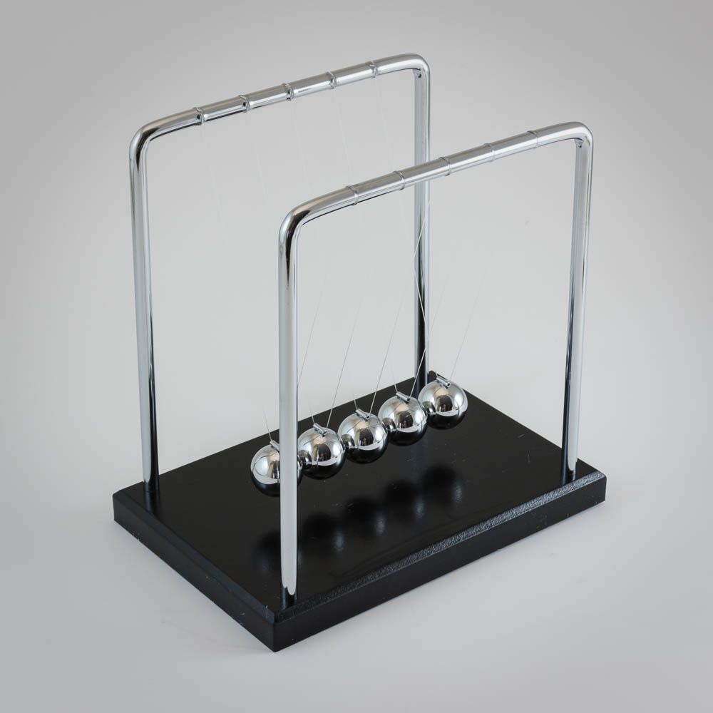 Enjoy classic physics-based play with the traditional Newton's Cradle! A chrome ball and sleek frame demonstrate Newton's Third Law. This traditional Newton's Cradle with five suspended desk balls illustrates all three of Newton's Laws of Motion. Made from high-quality materials like plywood, nylon, iron, and steel to ensure durability and long-lasting use. A modern swing-style design with a classic frame that has remained popular for centuries! A perfect gift for someone who loves physics or executive toys.