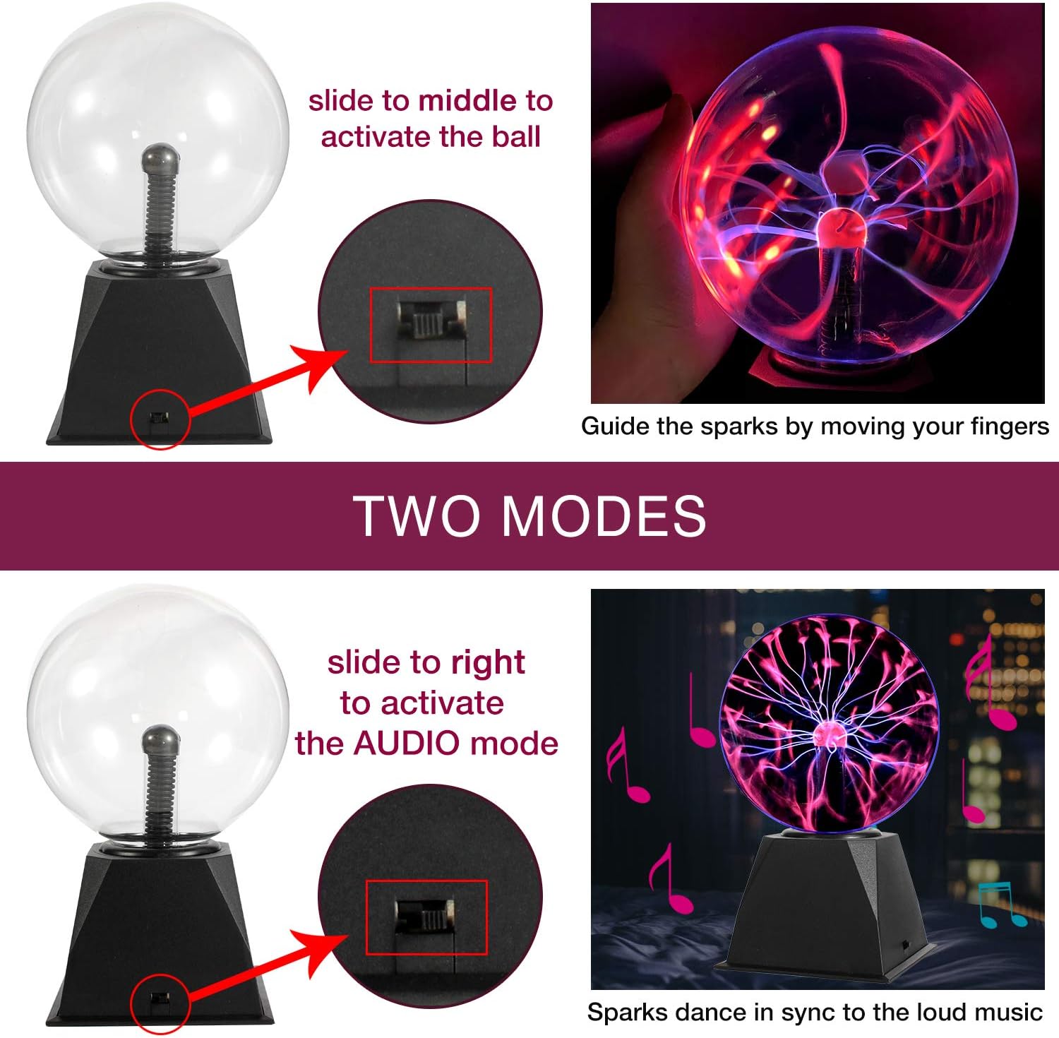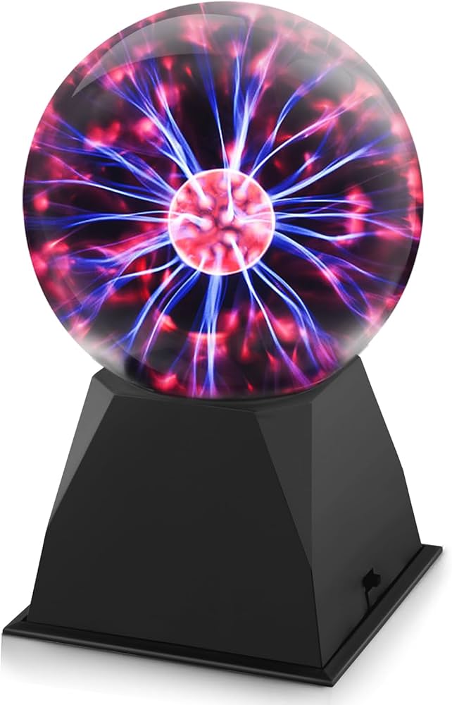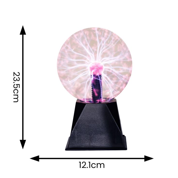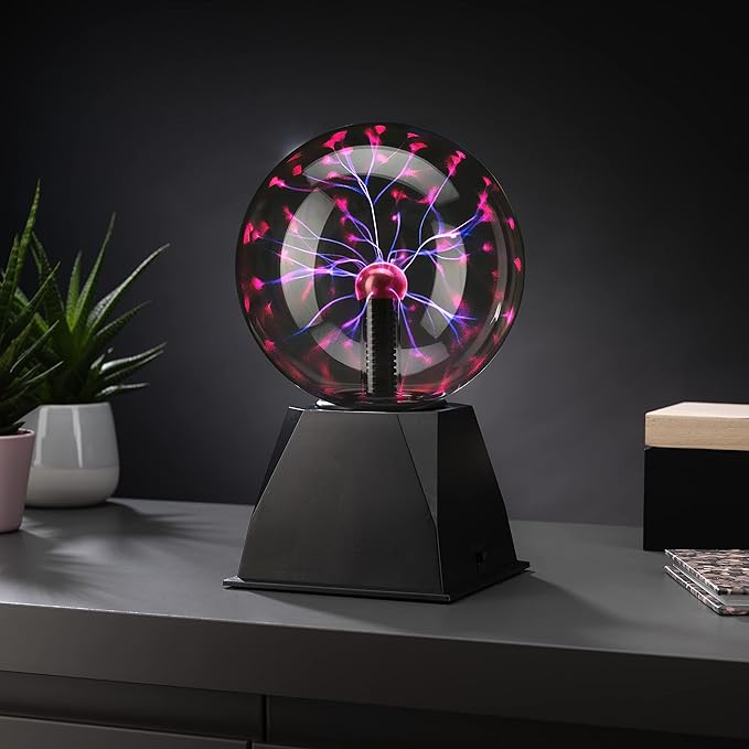 UK Mains Powered Switch Controlled Inert Gas Plasma Ball with 6" Glass Globe and ABS Plastic Base. The Classic Retro Science Gift that Looks Fantastic when it's Turned On, Left Alone, or Touched. Switch on Base to Select from Off to Always On and Sound Reactive Mode, where Streamers Emit to Audio. A Great Gift for People Interested in Science, Retro Lovers, as a Night Light, or for Mood Lighting.